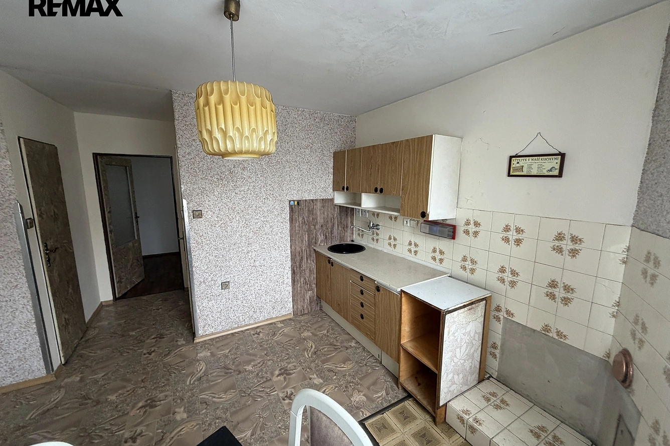 • Dispozice: Byt se nachází v levé části domu a sestává z kuchyně, samostatného obývacího pokoje, malé ložnice, předsíně a sociálního zázemí - WC samostatné.