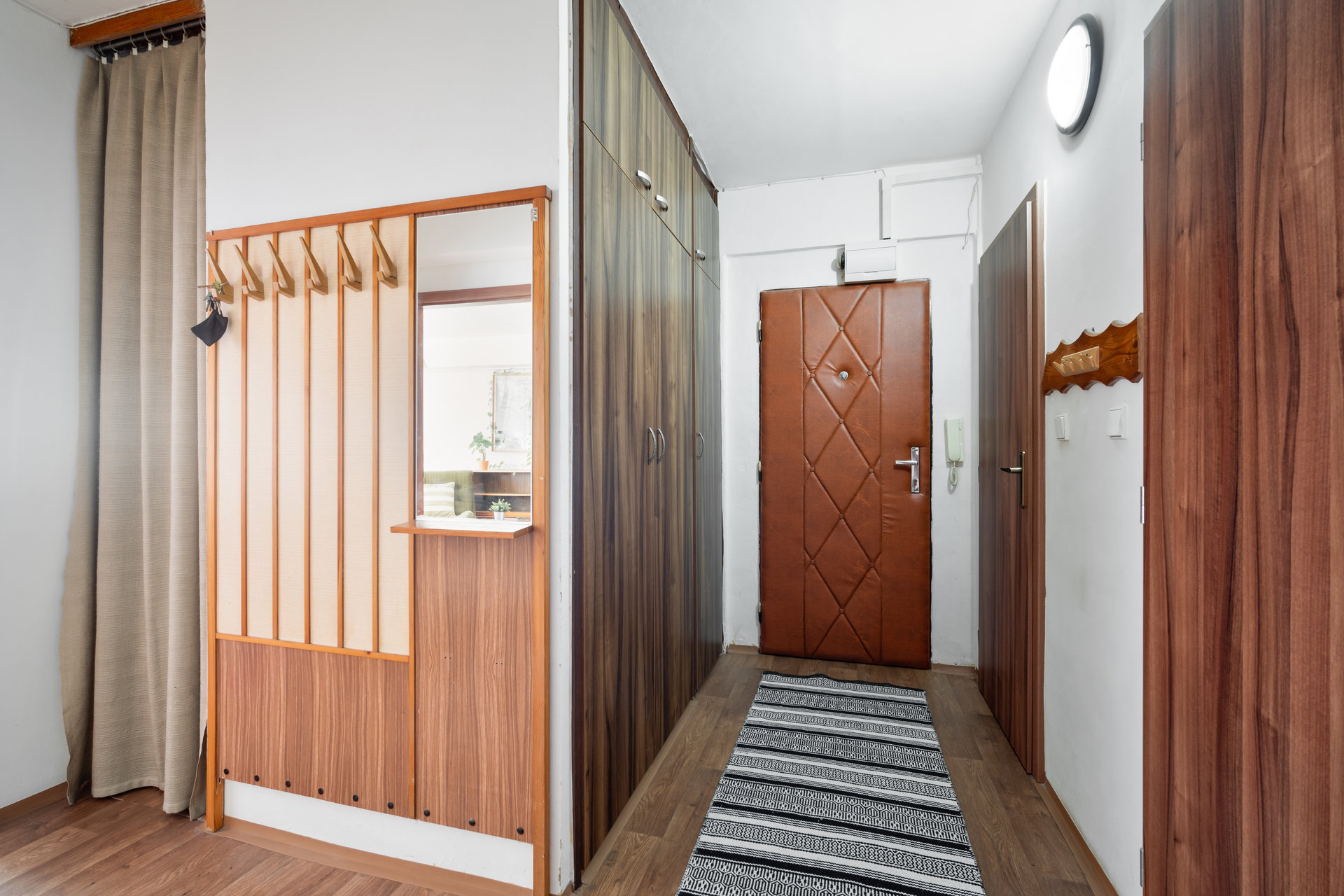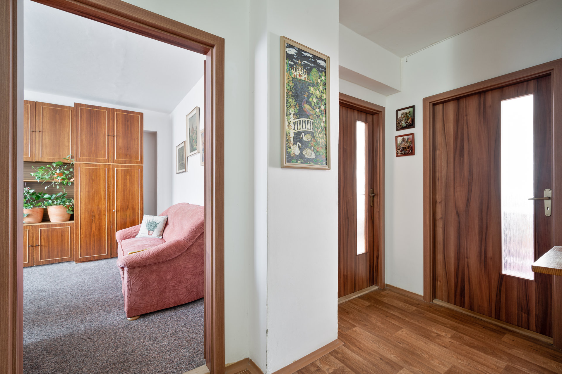 V chodbě za vestavěnou šatní skříní jistě oceníte prostor (vel. 2,2 m2), který lze využít jako spíž nebo šatnu.