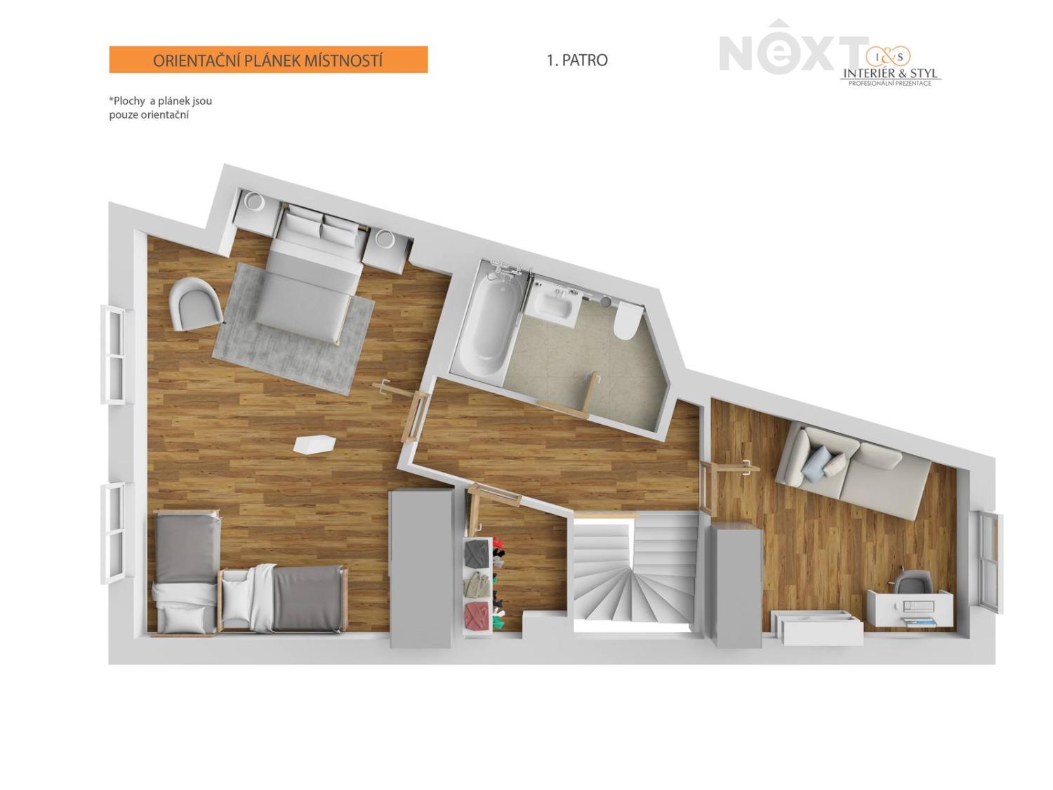 Dispozice bytu: zádveří a vstupní chodba, obývací pokoj propojen s kuchyňským koutem a výstupem na balkón, wc, po schodech do patra, kde jsou 2 samostatné pokoje, koupelna s vanou a technická místnost s možností zapojení pračky. Vytápění bytu a ohřev teplé vody zajišťuje společný plynový kotel pro každý blok.