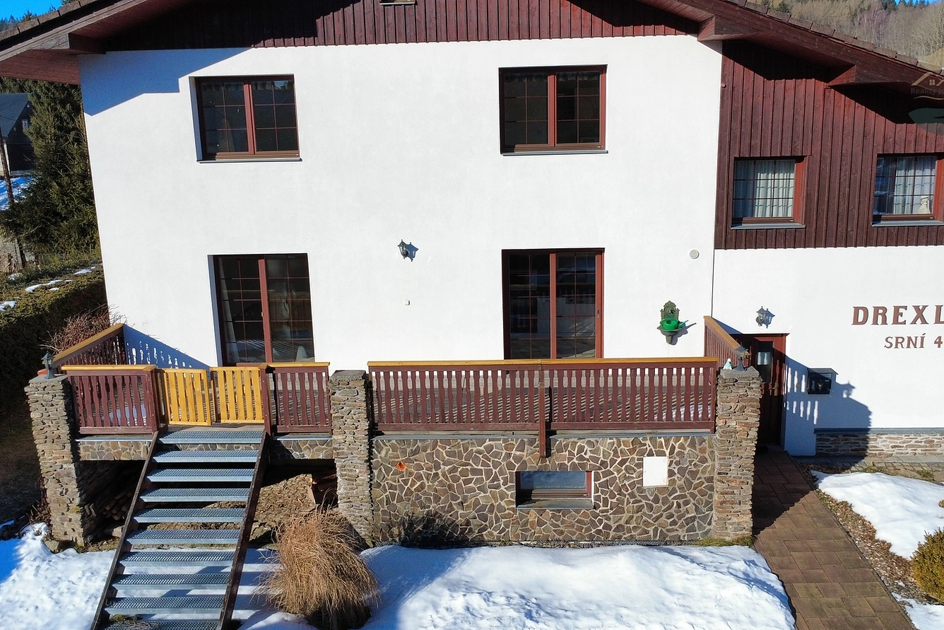 Byt se nachází v 1. nadzemním podlaží menšího rekreačního domu s pěti apartmány. Je kompletně vybavený a připravený k okamžitému užívání. Dispozice tvoří vstupní hala s úložnými prostory, hlavní koupelna s vanou i sprchovým koutem, dvě ložnice a prostorný obývací pokoj s jídelní částí a moderní kuchyní. Obytný prostor o rozloze téměř 38 m² nabízí krb, pohodlnou sedací soupravu a přímý vstup na velkou terasu s posezením. Hlavní ložnice má přes 17 m², druhá ložnice 15 m² a navíc vlastní koupelnu se sprchou a WC.