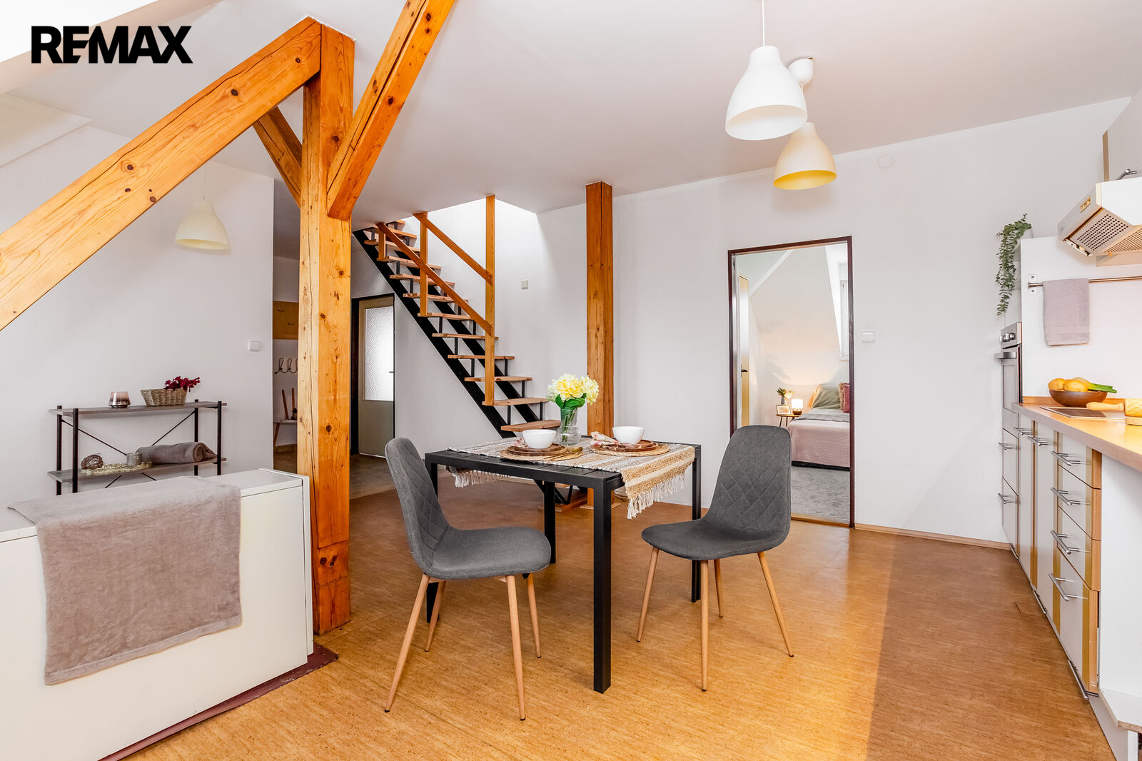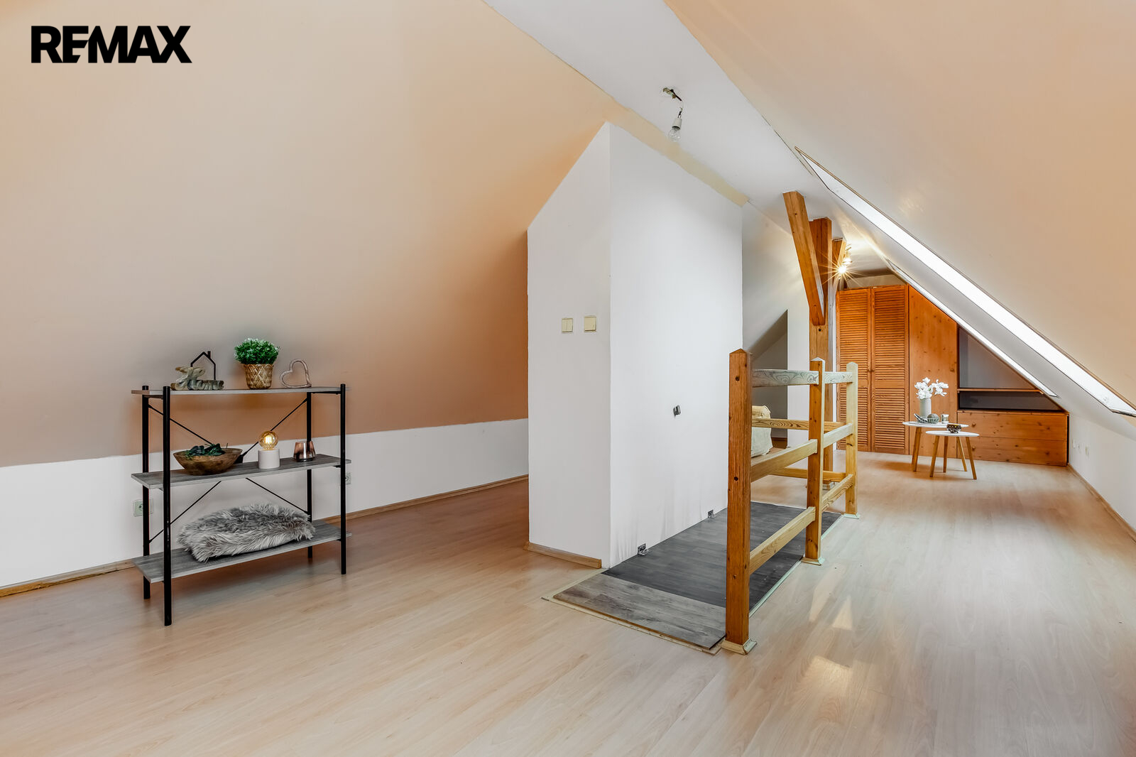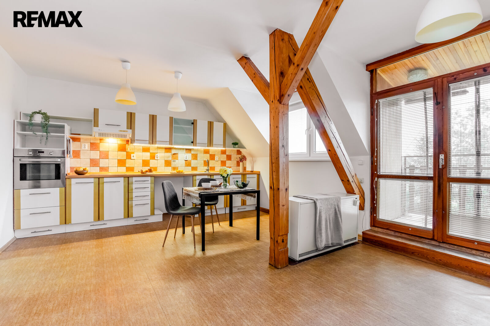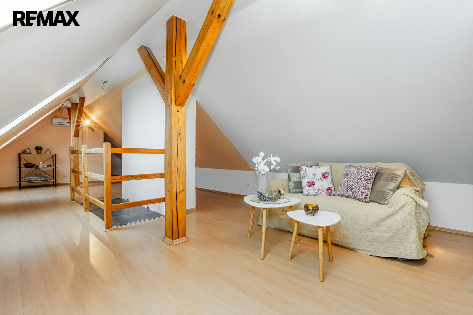 Tento atypický byt s lodžií a zahradou nabízí široké možnosti pro realizaci vlastních představ o bydlení. Kouzelnou atmosféru vytvářejí velká okna, odhalené trámy a podkrovní pokoj, který prostoru dodává jedinečný charakter.