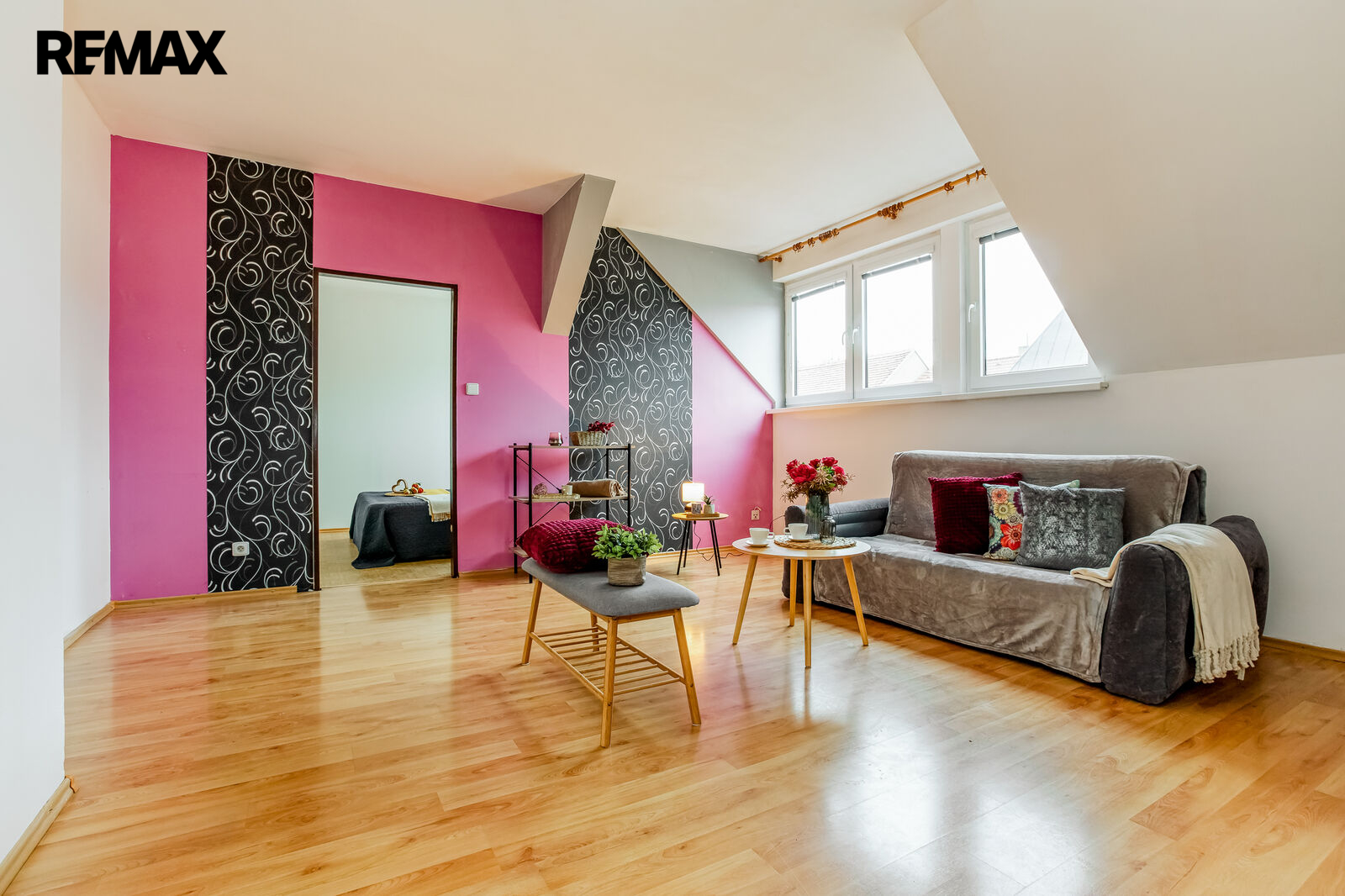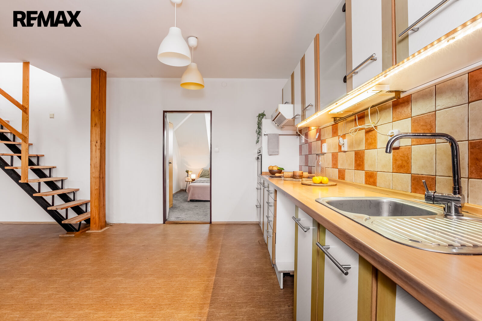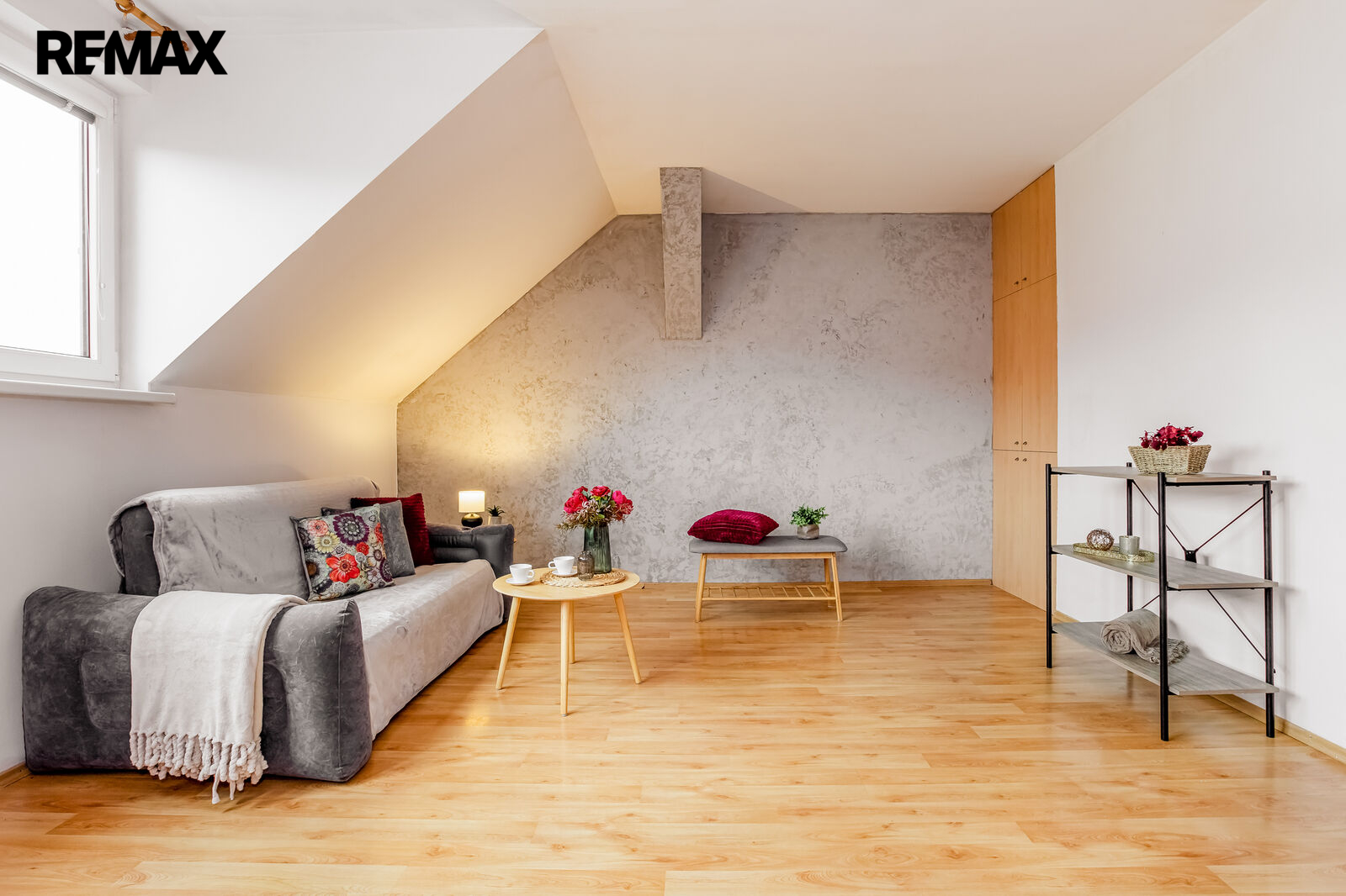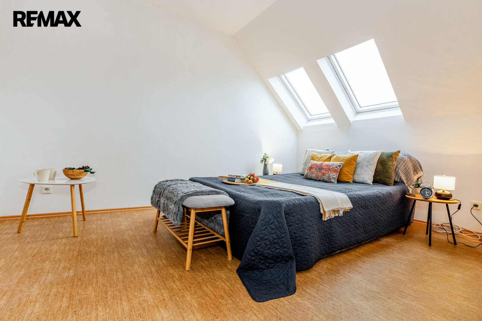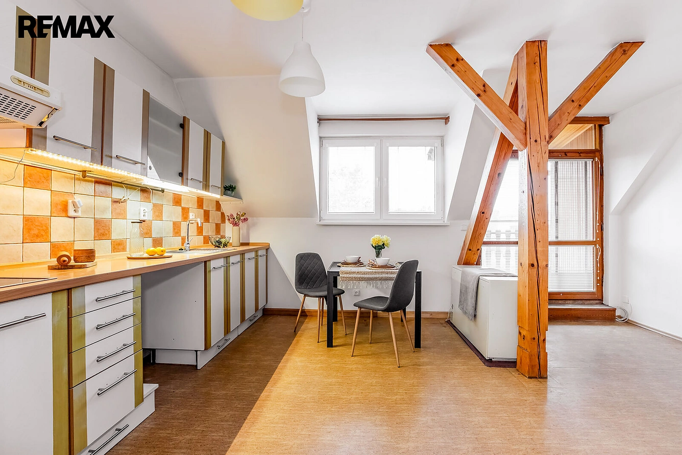 Tento atypický byt s lodžií a zahradou nabízí široké možnosti pro realizaci vlastních představ o bydlení. Kouzelnou atmosféru vytvářejí velká okna, odhalené trámy a podkrovní pokoj, který prostoru dodává jedinečný charakter.