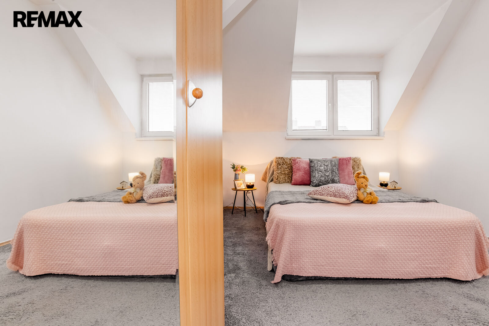 Obývací pokoj (21,3 m²) a dvě samostatné ložnice (14,1 m² a 12,7 m²) jsou orientovány na východ, poskytují dostatek soukromí a prostoru pro celou rodinu. Koupelna (5,4 m²) je vybavena vanou a umyvadlem, WC (1,4 m²) je samostatné.