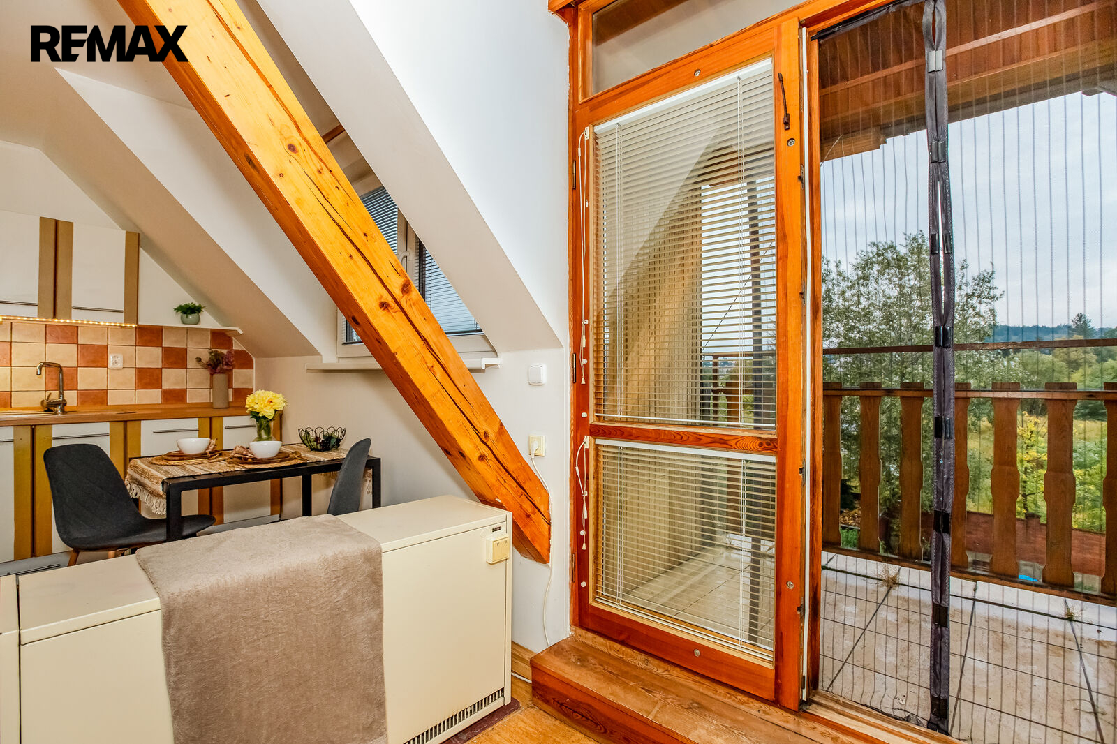 Do vzdušného podkrovního pokoje se dostanete po dřevěném schodišti vedoucím z hlavního pokoje. Podkroví je klimatizované, což přispívá ke komfortu v letních měsících.