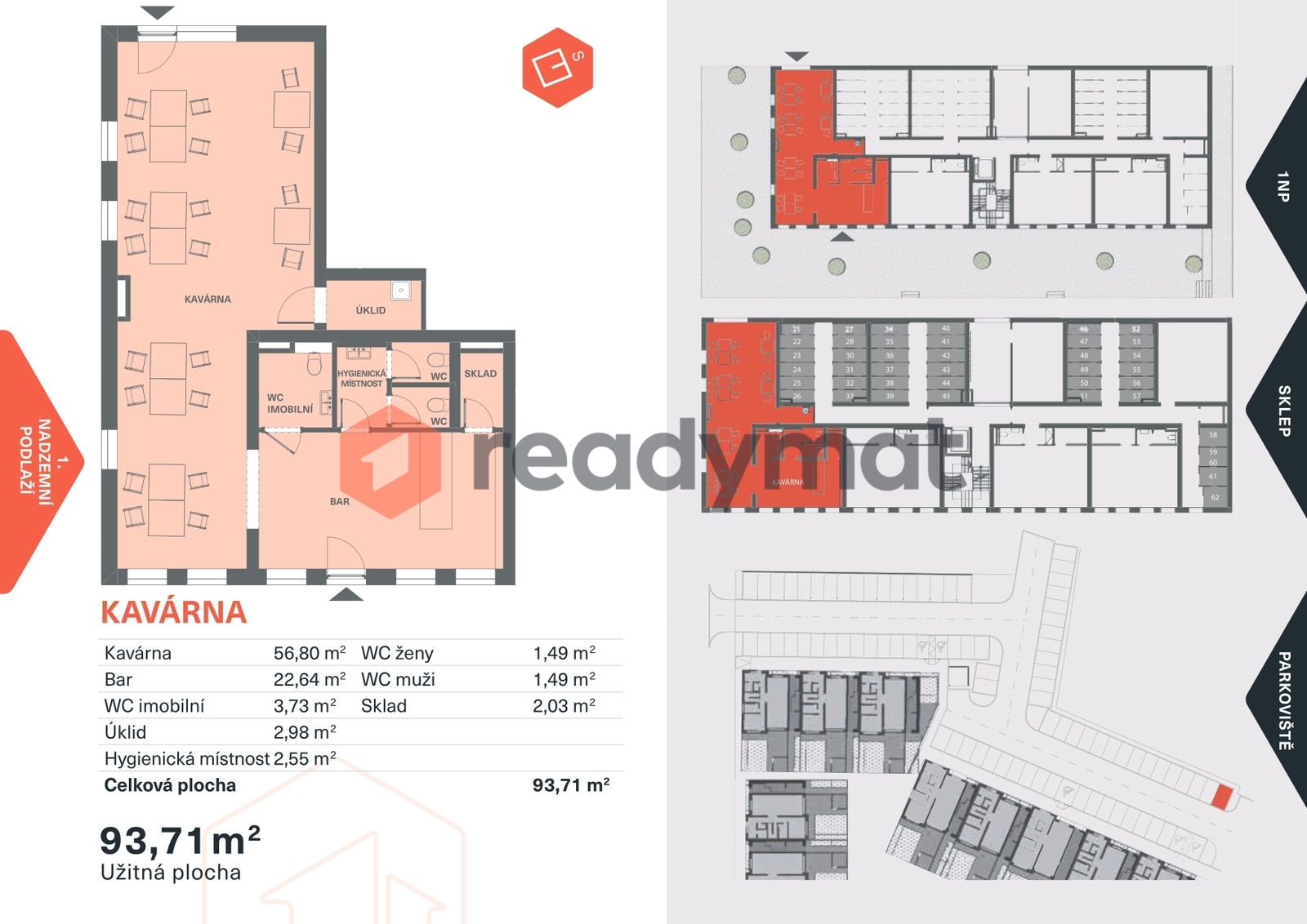 • velkorysý prostor 93,71 m² s možností uspořádání kavárny s posezením i zázemím