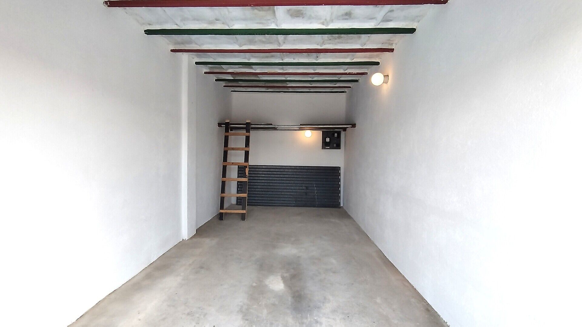 Konstrukce garáže cihla, podlaha betonová, strop panelový, plechová vrata, úložný regál na pneumatiky..., žebřík, zavedena elektřina - elektroměr s odečtem.