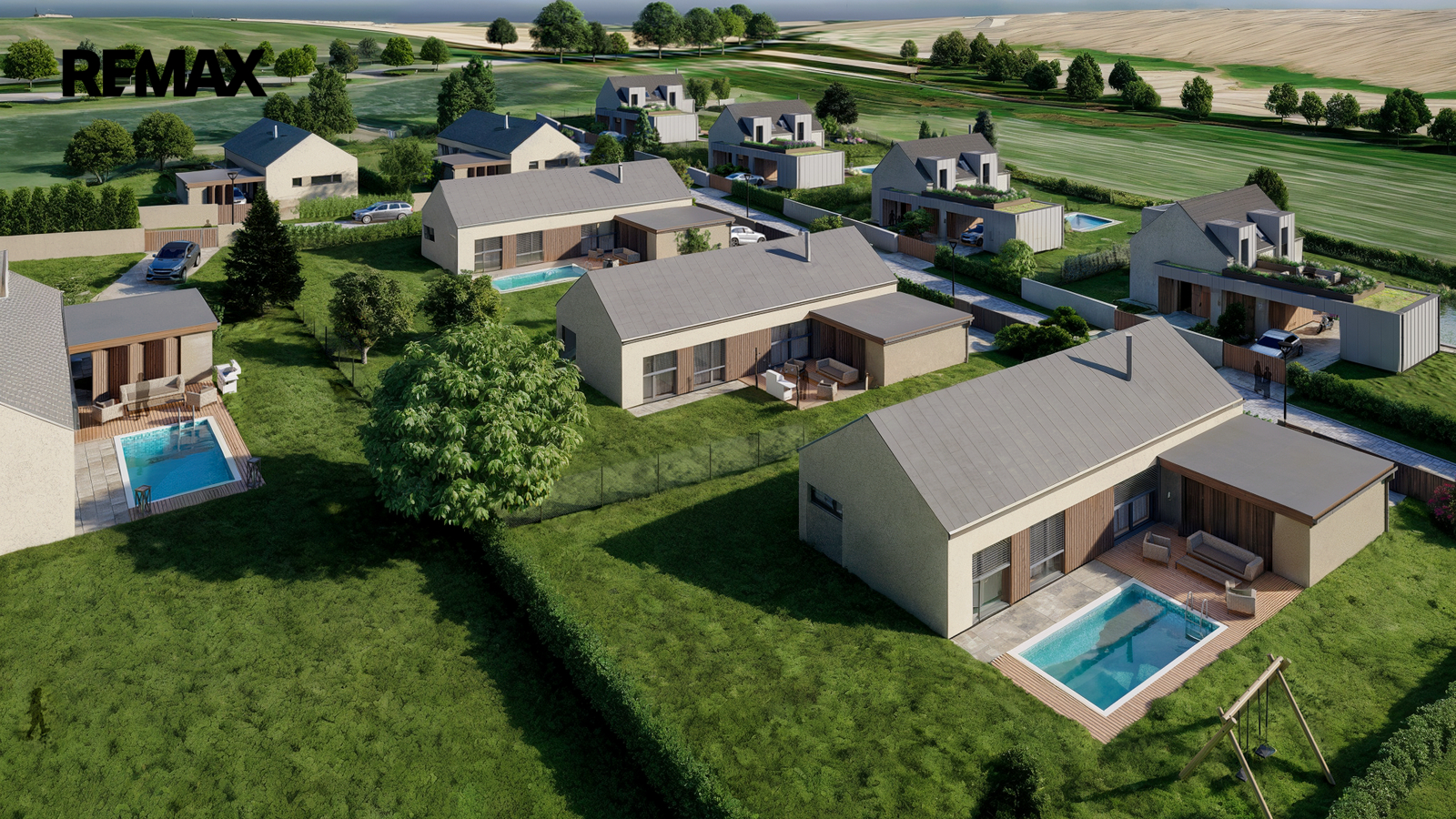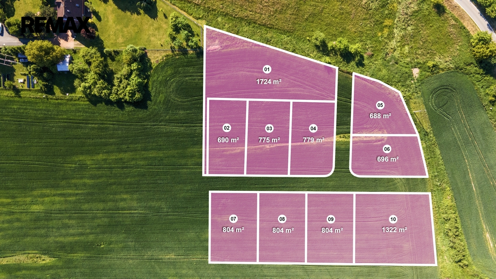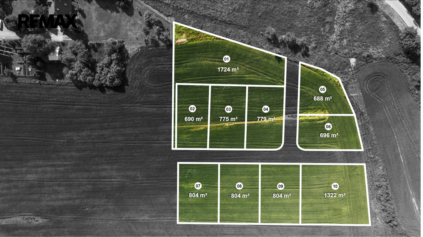 Taktéž budou fyzicky vybudovány příjezdové cesty včetně napojení na stávající asfaltovou komunikaci - vše je již zahrnuto v kupní ceně jednotlivých pozemků. Výměry od 688 m2 až po 1724 m2 - viz. grafika, která je součástí fotogalerie i videoprezentace. Vizualizace výstavby - kterou rovněž najdete ve fotogalerii - odpovídá reálné parcelaci. Ideální jihozápadní orientace celku, slunné místo, dobré klima.