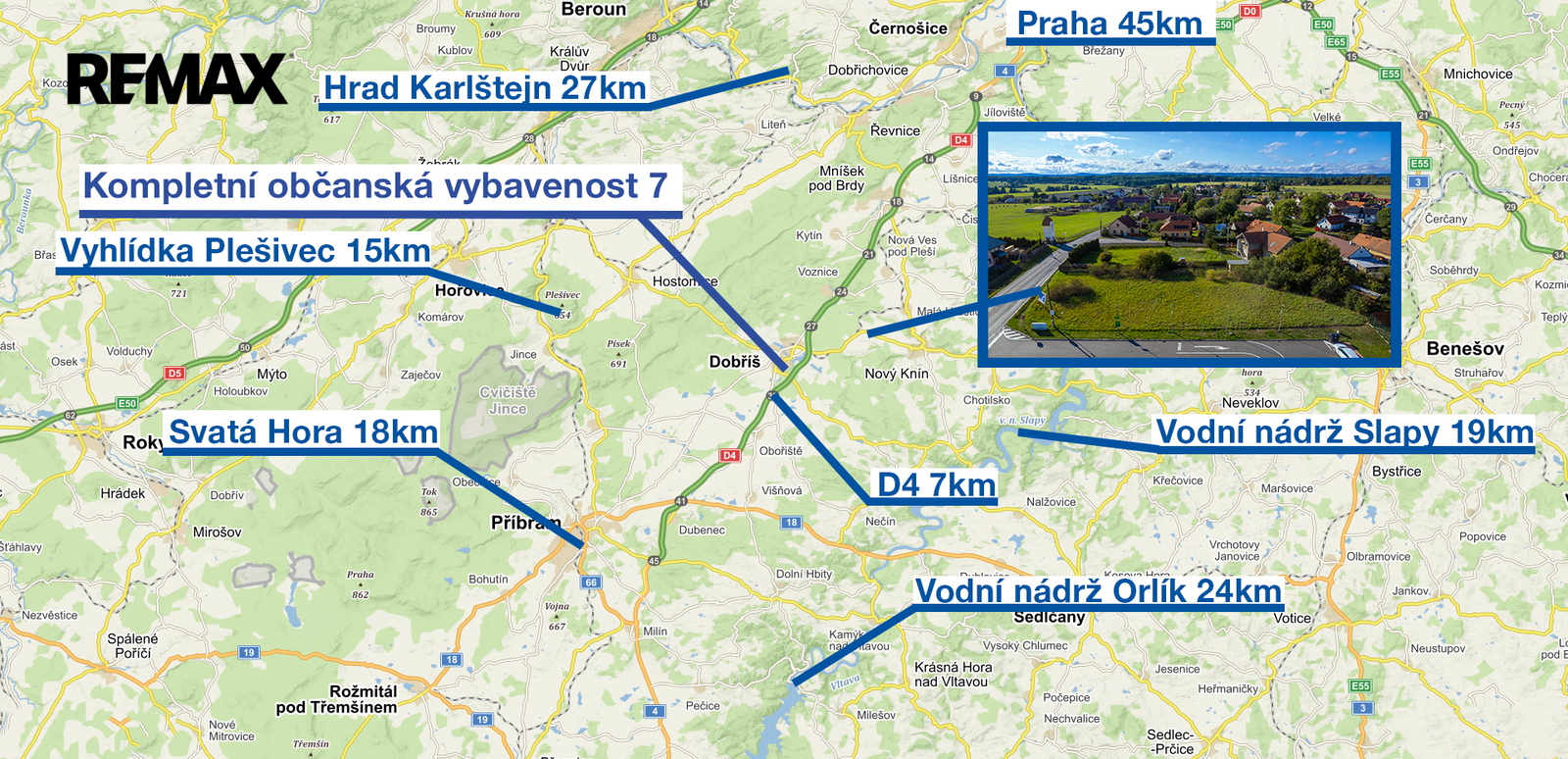 Pro pracující: Dobříš 6 km, Praha do 35 minut po dálnici D4.