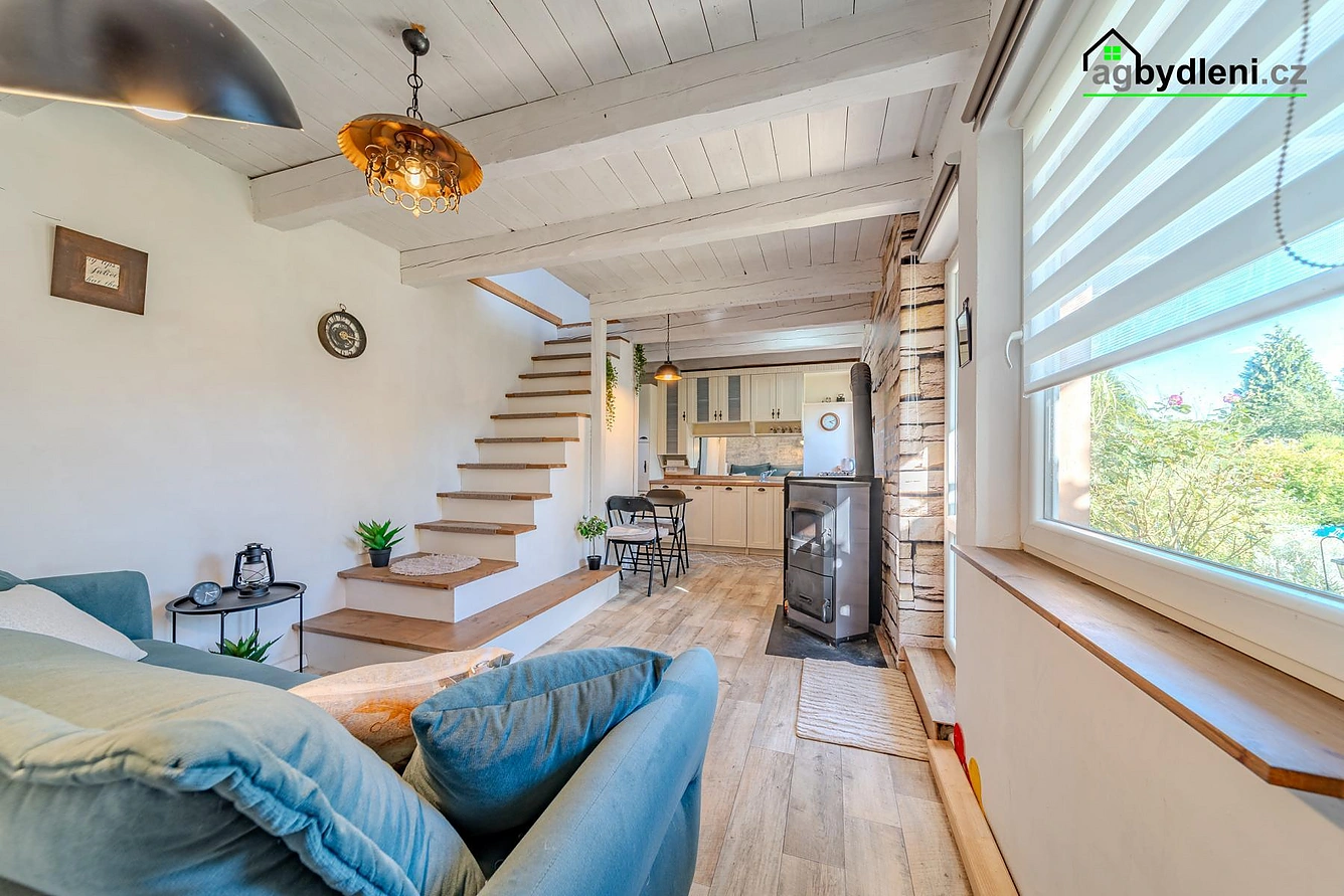 Přízemí (30 m2) hlavní obytný prostor s krbovými kamny, kuchyňským koutem, přímý vstup francouzským oknem na terasu a koupelnou
