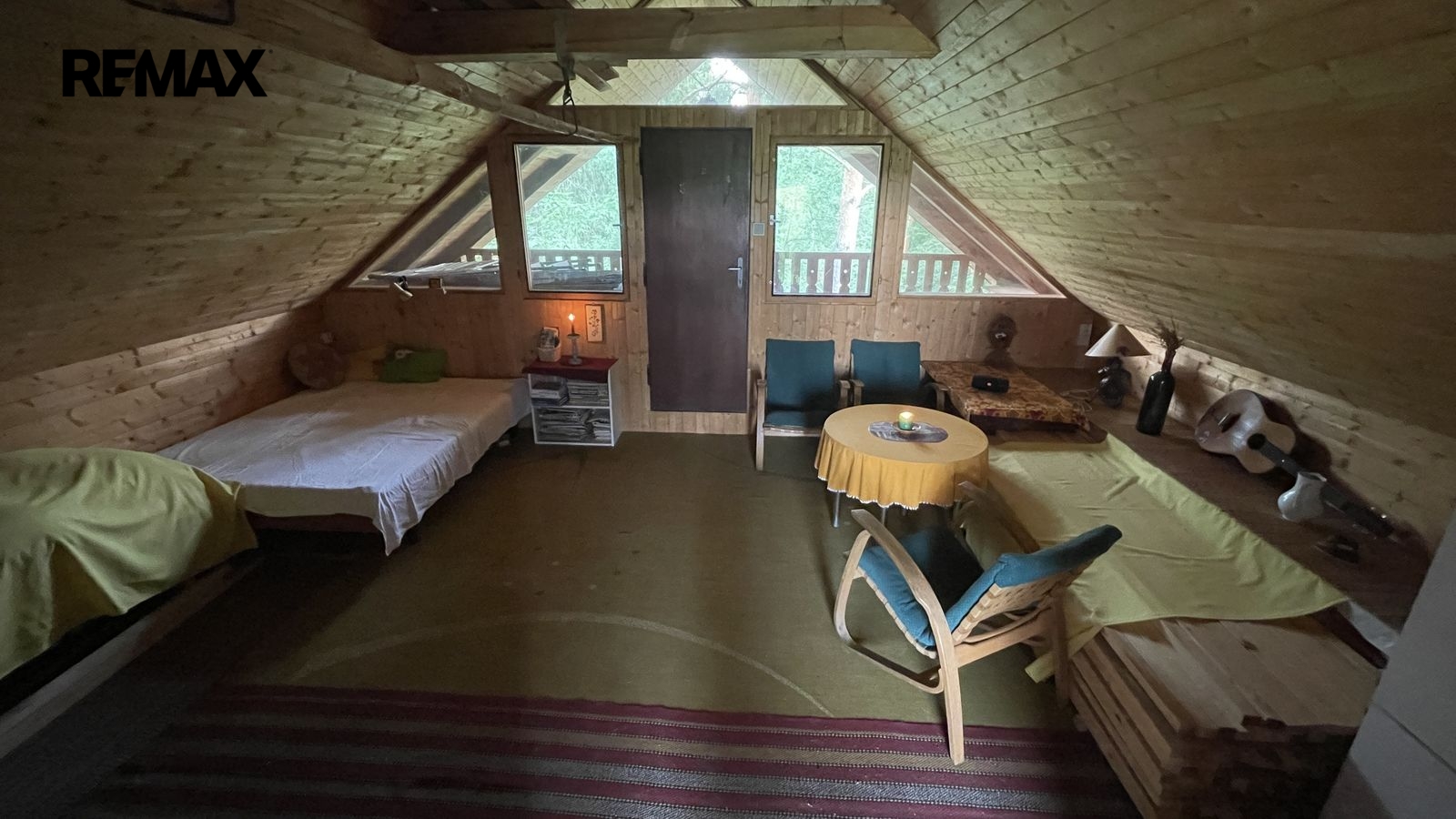 Chata je částečně podsklepená, ve sklepě je sklad a samostatná toaleta, vstup do sklepa je samostatný z boku chaty. V přízemí je kuchyně, obývací pokoj a veranda/zasklená terasa, která se používá jako ložnice. Podkroví má samostatný vstup zvenku po dřevěném schodišti. Zde je kuchyně a obývací ložnice a také vstup na balkon. Odtud je částečný výhled na řeku.